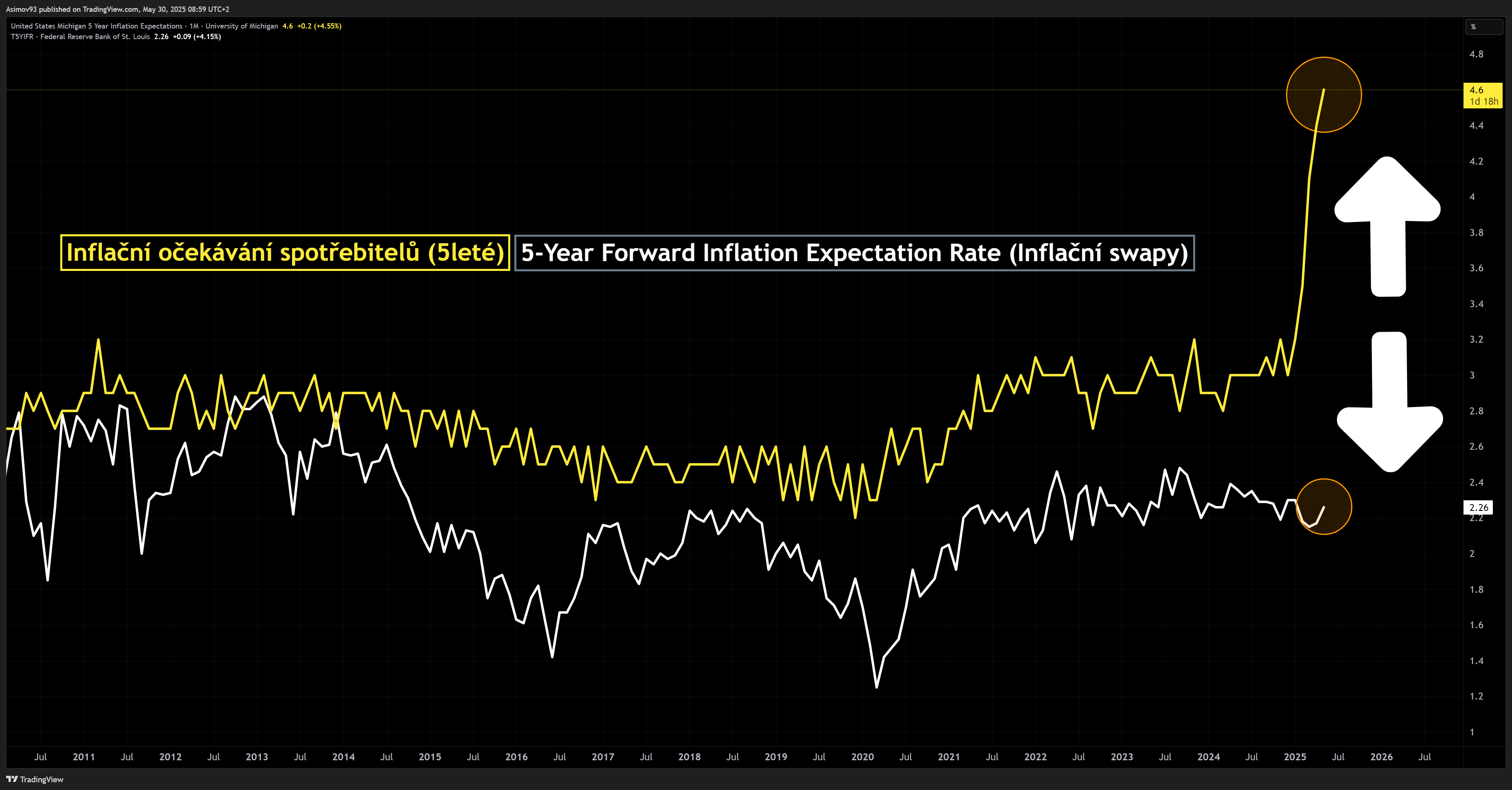Ono možné odukotvení indikují soft data, která zveřejňuje Michiganská univerzita. Dle jejich výzkumu je 5leté inflační očekávání spotřebitelů na 4,6 %.