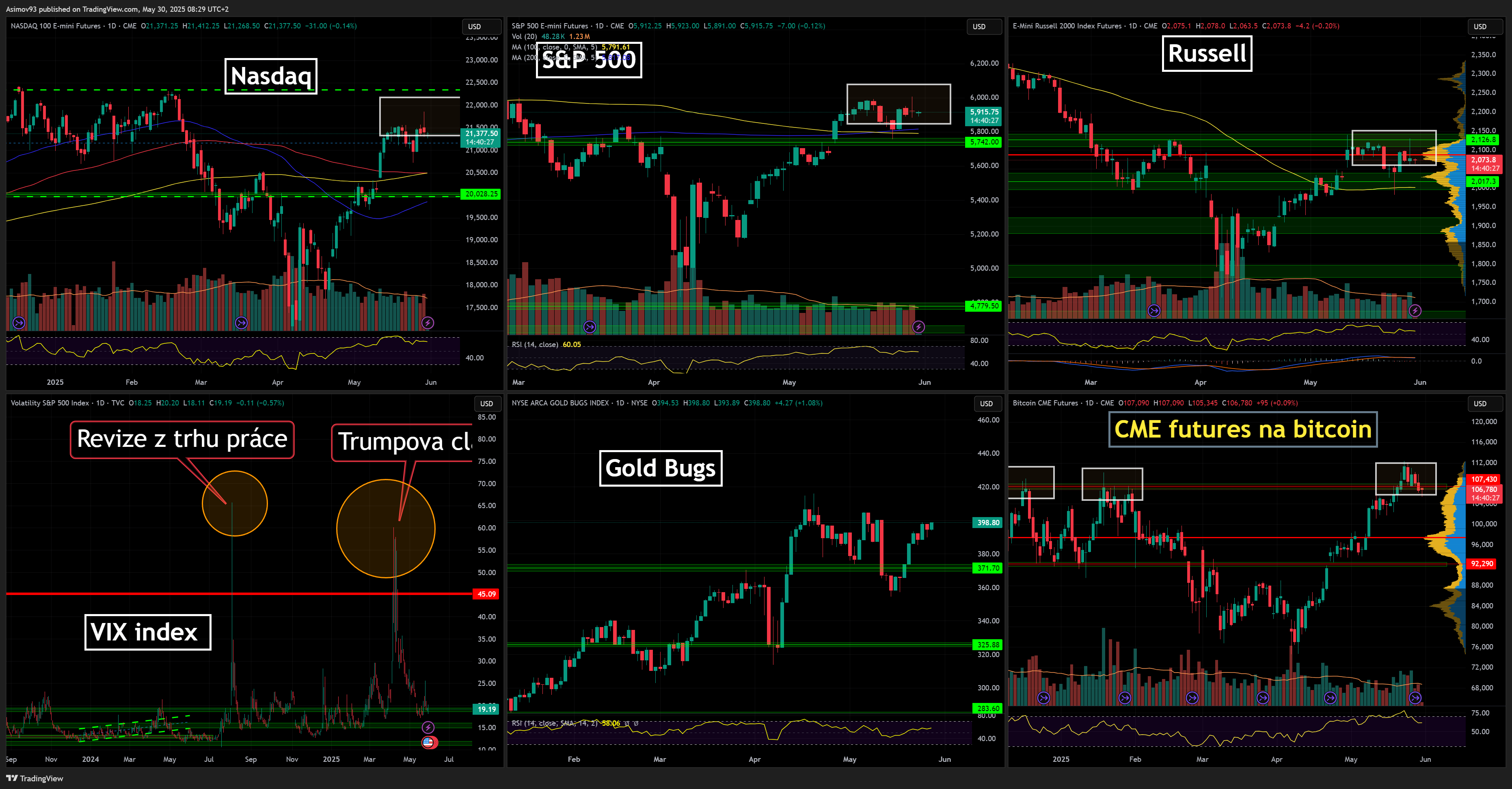 Hlavní americké akciové indexy a CME futures na bitcoin