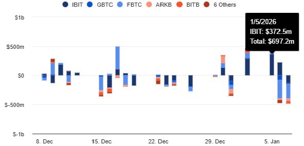 Celkově za poslední tři dny opustilo bitcoinová ETF zhruba 1,12 miliardy dolarů. To prakticky vymazalo veškeré čisté přítoky z prvních dvou obchodních dnů letošního roku. Přesto samotná cena Bitcoinu (BTC) zůstává relativně klidná.