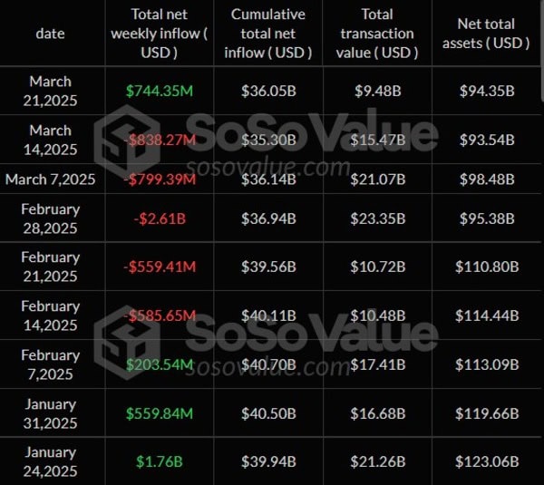 V týdnu končícím 21. března zaznamenala bitcoinová ETF příliv kapitálu od investorů ve výši 744,4 milionu dolarů, což podle dat SoSoValue představuje největší příliv za posledních osm týdnů.