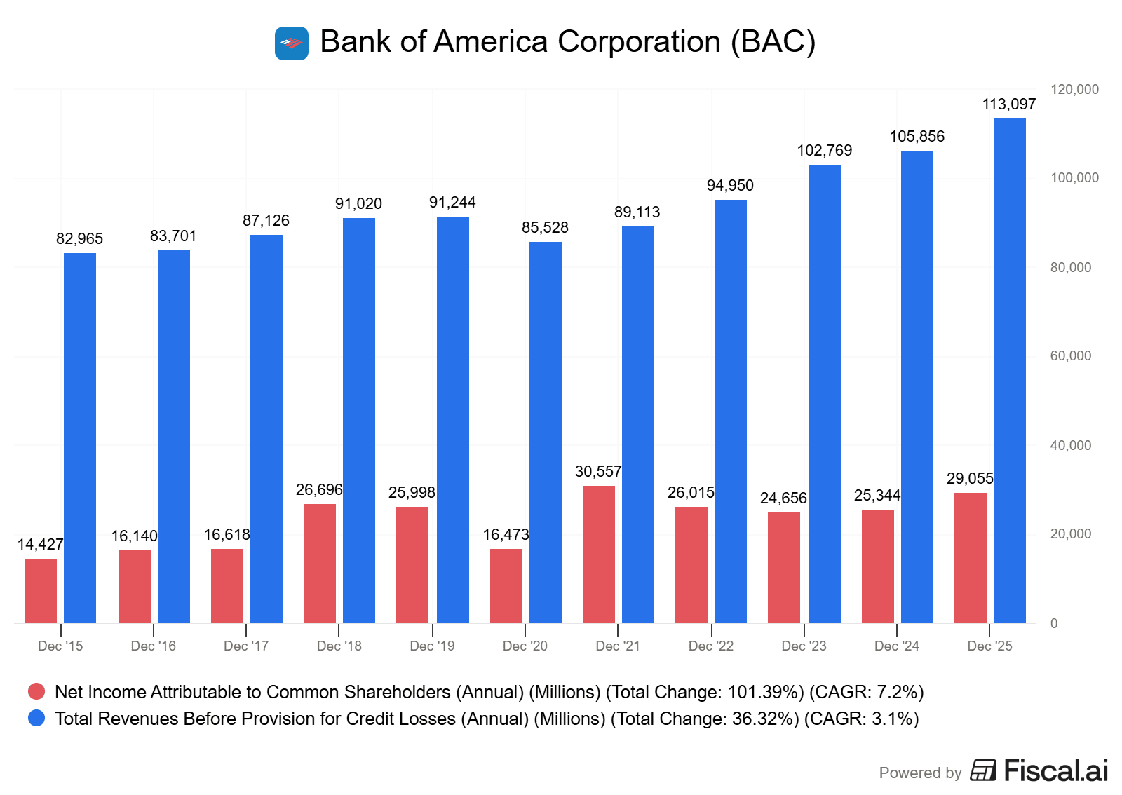 V roce 2025 dosáhla Bank of America tržeb ve výši 113,1 miliardy dolarů, což představuje 7% nárůst oproti roku 2024.