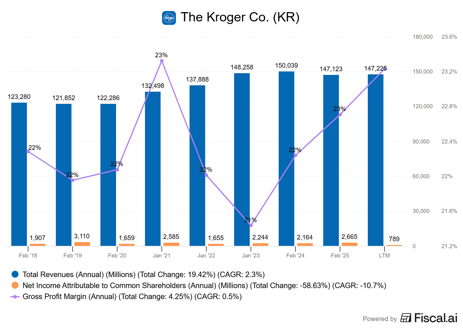 Tato velikost mu dává obrovskou vyjednávací sílu vůči dodavatelům a značné nákladové výhody v distribuci. Kroger provozuje napříč USA 2 700 obchodů s potravinami a zhruba 2 200 lékáren. Každý den tak obslouží na 11 milionů zákazníků.