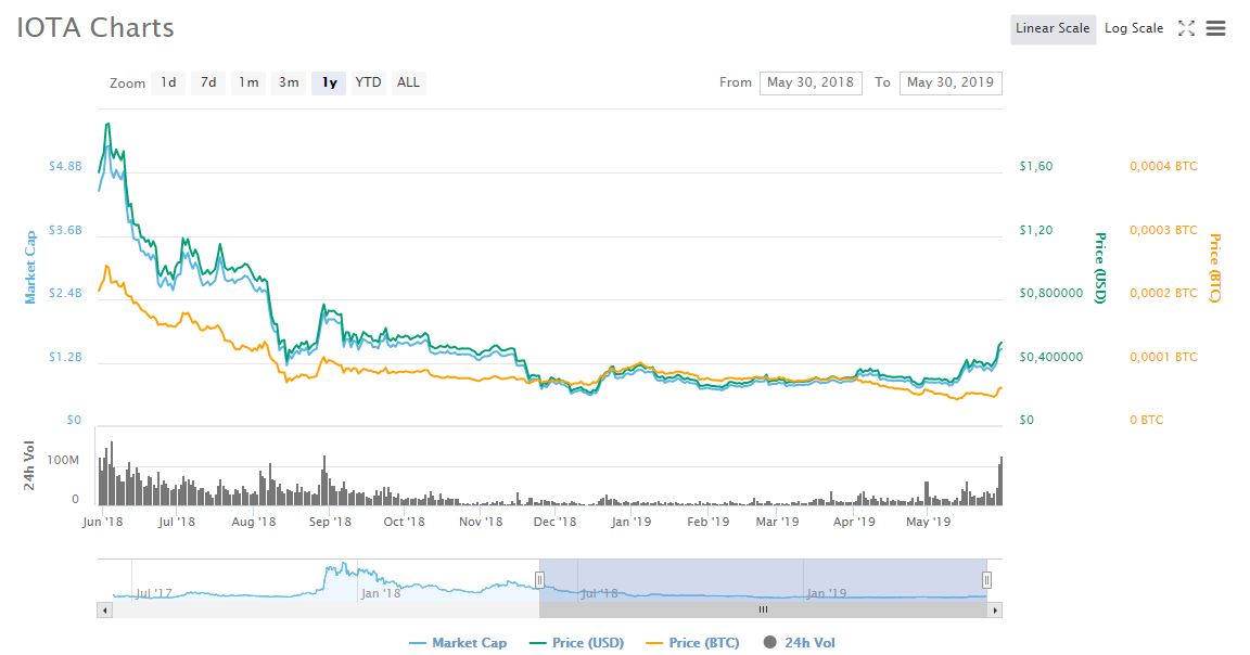 Vývoj IOTA kurzu za poslední rok (zdroj: CoinMarketCap)