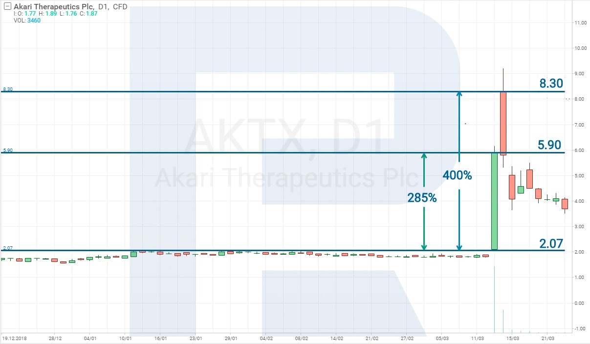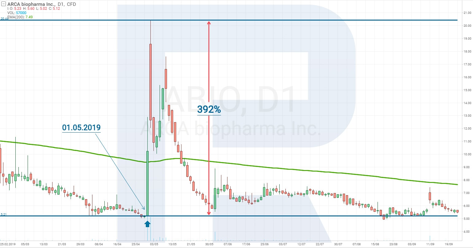 Jednoduchý příklad: 1. května 2019 biotechnologická společnost ARCA Biopharma, Inc. (NASDAQ: ABIO) zveřejnila výsledky druhé testovací fáze léku Genetic-AF. Tato zpráva sama o sobě zvýšila cenu akcií společnosti o 392 % za pouhé dva dny.