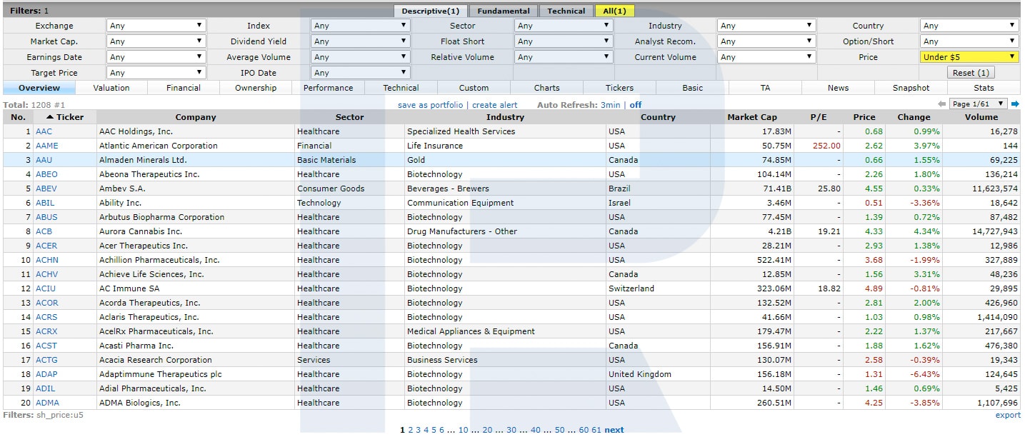 Zaměříme se tedy na společnosti s cenou akcií pohybující se pod 5 USD, což sníží počet společností v našem vyhledávání na 1208.