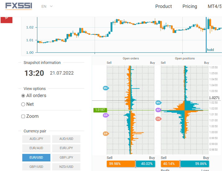 Zdá se ale, že informaci o všech objednávkách ani nepotřebujete. Vycházím z toho, že retailoví tradeři dělají pořád ty stejné chyby a umísťují svoje objednávky do míst, na který dojde spolehlivě k vymetení stop losu. Této znalosti využívá indikátor sentimentu DOM snapshots, který je k dispozici na této webové stránce: DOM Snapshots | FXSSI – Forex Sentiment Board. Indikátor ukazuje čekající objednávky (order book) klientů u brokera OANDA. Tedy pouze malou část trhu.