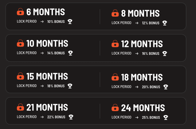 Jakmile předprodej skončí, své tokeny $FGHT si budete moci vyzvednout po vámi zvolené době tzv. vestingu (uzamčení tokenů $FGHT). Čím delší ji nastavíte, tím lepší odměny získáte. Základní doba vestingu jsou 3 měsíce a poté se můžete těšit na bonusy v podobě procentuálního přírůstku tokenů $FGHT k vámi zakoupené částce.