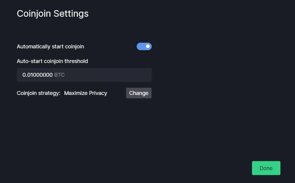 Už při zakládání peněženky se vás aplikace zeptá, jak (a jestli vůbec) chcete automatický CoinJoin provádět. CoinJoin se dá provádět různými způsoby úpravou více parametrů.