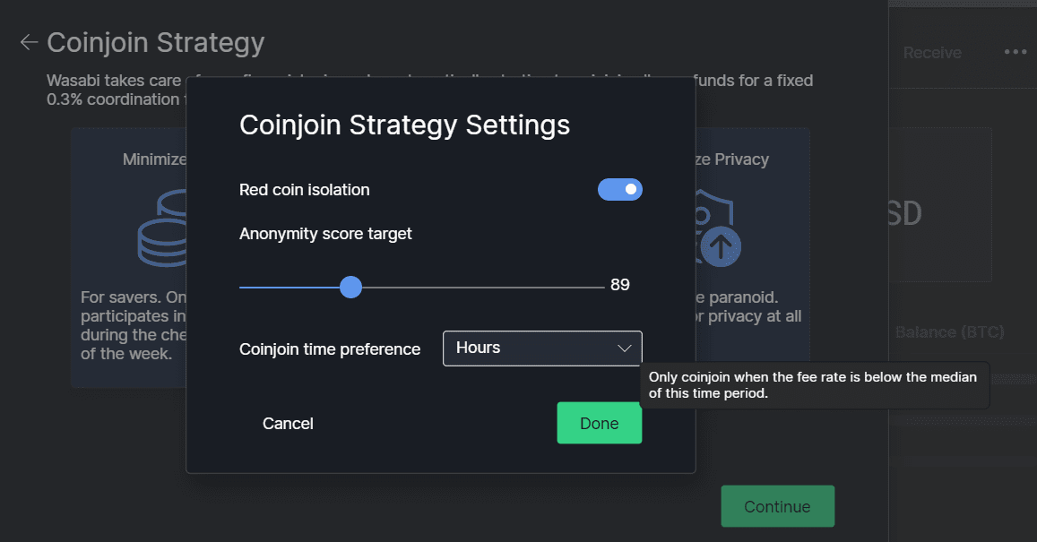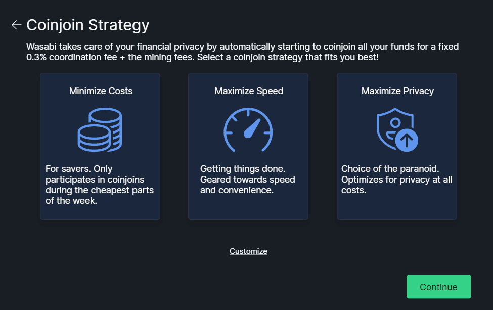 Abyste se tímto nemuseli zatěžovat, Wasabi Wallet vám nabídne 3 přednastavené varianty – defaultně nastavenou nejvyšší rychlost mixování, minimalizaci nákladů a co nejvyšší úroveň soukromí výměnou za delší dobu mixování a možné vyšší poplatky.