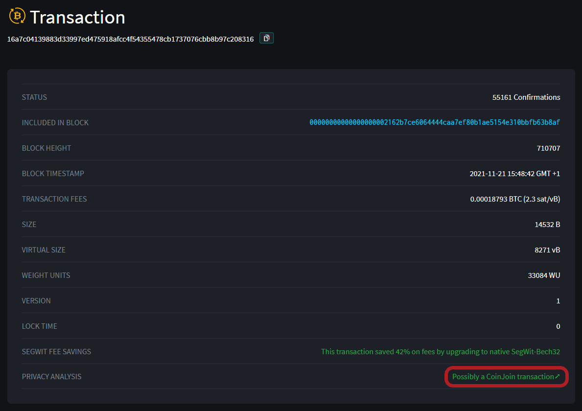 Transparentnost blockchainu Bitcoinu umožňuje dohledat, které bitcoiny přes CoinJoin prošly a které nikoliv.
