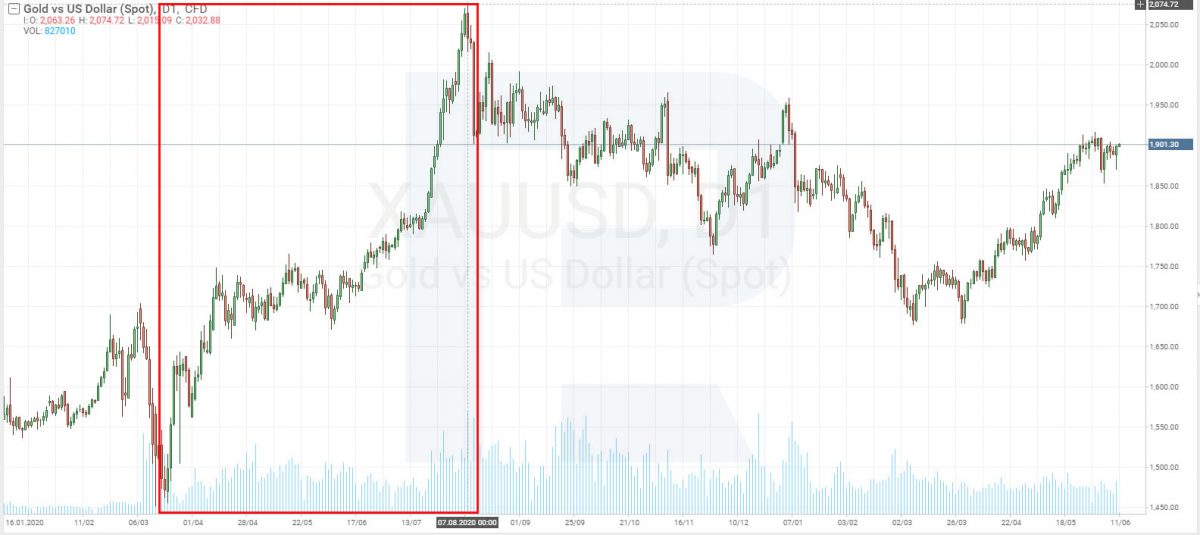 Graf XAU/USD během pandemie koronaviru v roce 2020