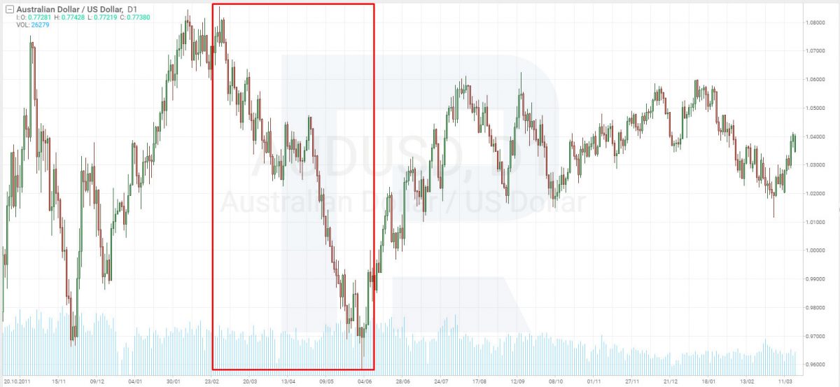Graf AUD/USD během povodní v Austrálii v březnu 2012