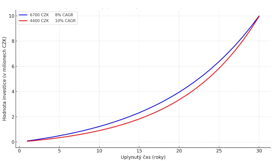 Mimochodem, kdybyste pouze pravidelně investovali, tedy vaše počáteční investice by byla nulová. “Stačilo” by vám s ročním zhodnocením 8 % ročně investovat pravidelně měsíčně 6 700 korun, abyste po třiceti letech disponovali 10 miliony. S ročním zhodnocením 10 % (dlouhodobý průměr amerického akciového trhu) by vám pak stačila pravidelná měsíční investice 4 400 Kč.