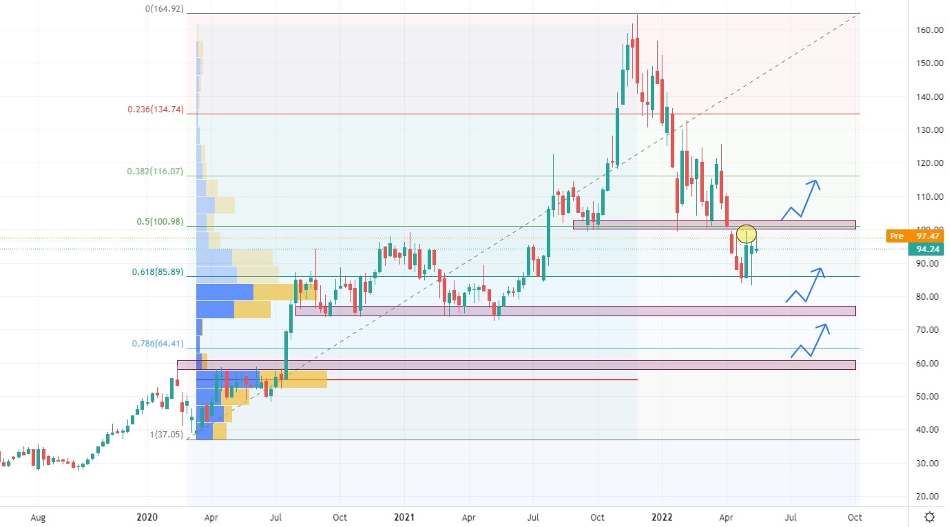 Nejbližší support se nachází na ceně 75 USD, který tvoří i dlouhodobá Low. Nejsilnější Volume oblast se na akciovém grafu nachází na ceně 60 USD, která může díky vysokému objemu působit jako magnet a tak přilákat investory. Společnost AMD nevyplácí dividendy.