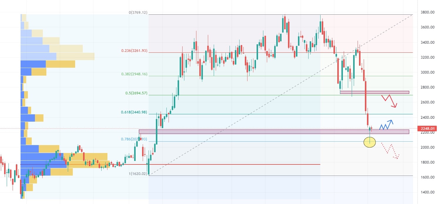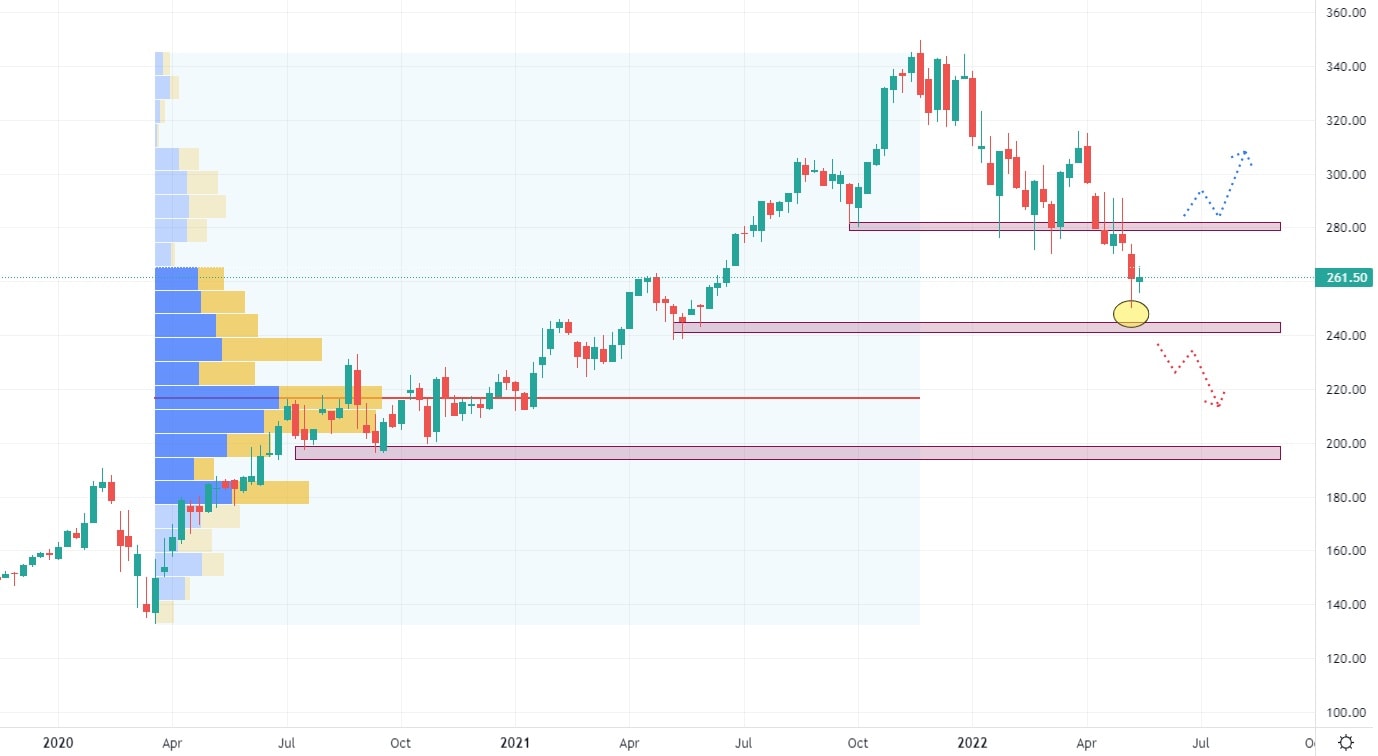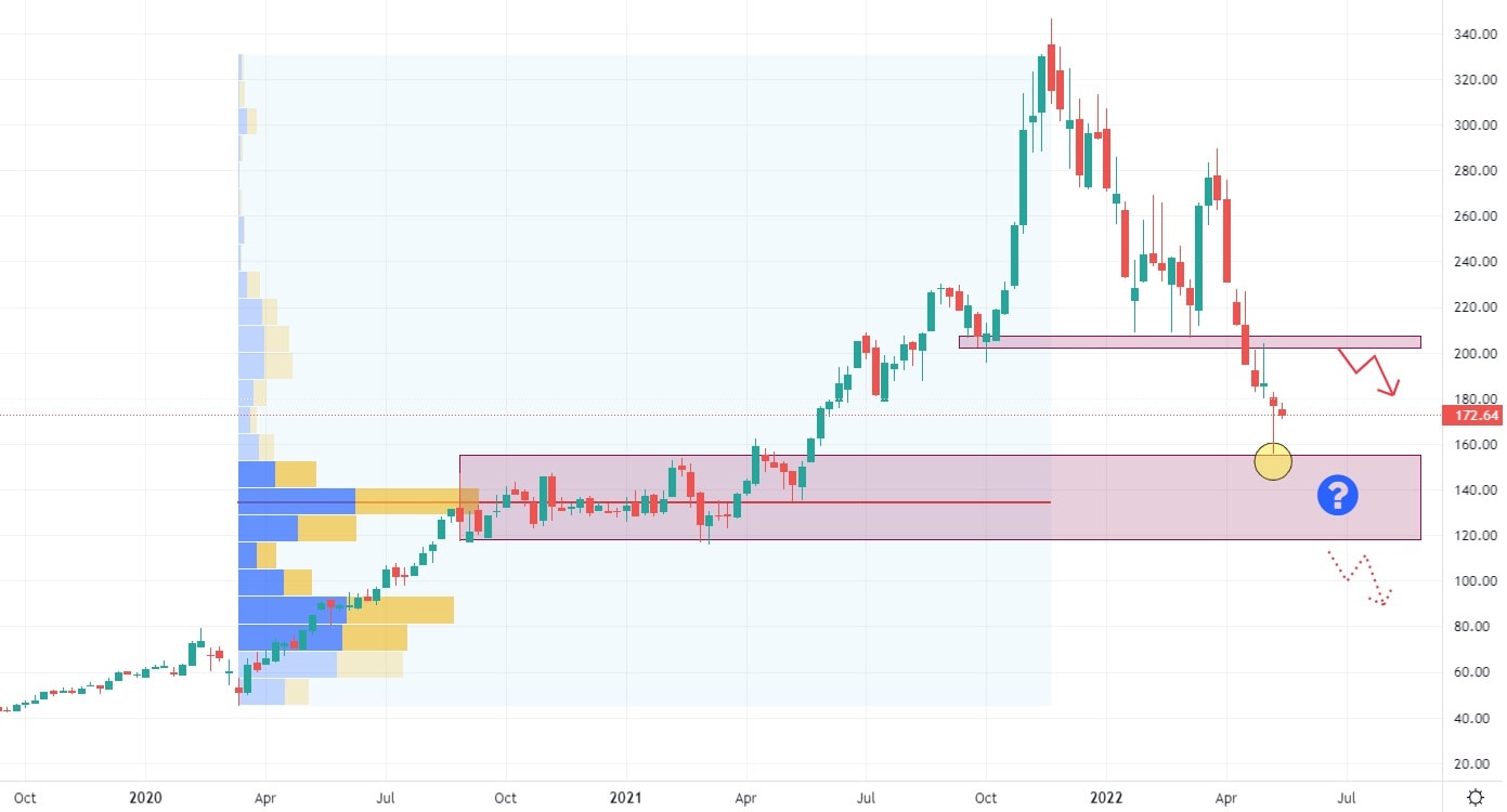 Propad 37 % akcií Amazon, byl prozatím zakončen technickou formací Pin bar, která v technické analýza predikuje obrat dosavadního sentimentu. Zda to bude platit i pro akcie Amazonu, se uvidí v budoucnu. Prozatím se tento titul obchoduje na výrazné supportní zóně, která tvoří konfluenci s velmi silnou Volume oblastí.