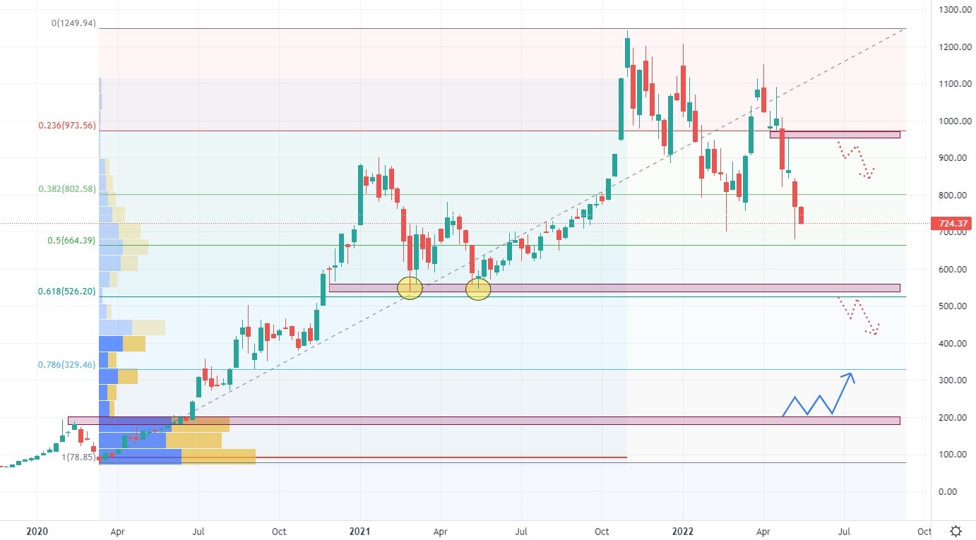 Pokud dojde k tomuto negativnímu scénáři, může být pokles zastaven na cenové úrovni 550 USD, kde se nachází nejbližší supportní zóna. Společnost ovšem vykazuje velmi dobrá čísla, především co se týká tržeb. Meziroční růst o 73 % a velmi pozitivní predikce, které počítají s růstem tržeb v roce 2022 na 87 miliard USD (z 54 mld. v roce 2021) až na 115,6 miliardy USD v roce 2023. Akcie společnosti Tesla jsou především spekulativní nástroj, protože společnost nevyplácí dividendy.