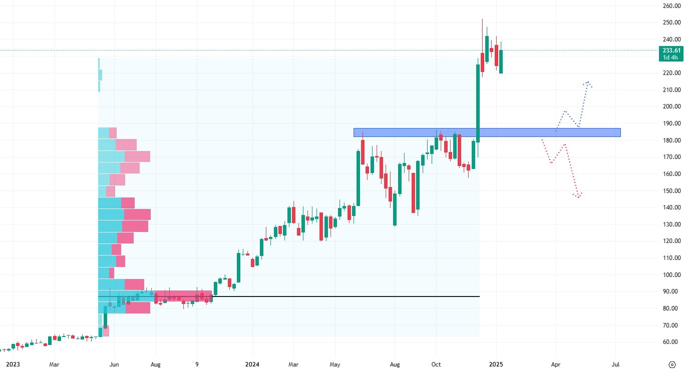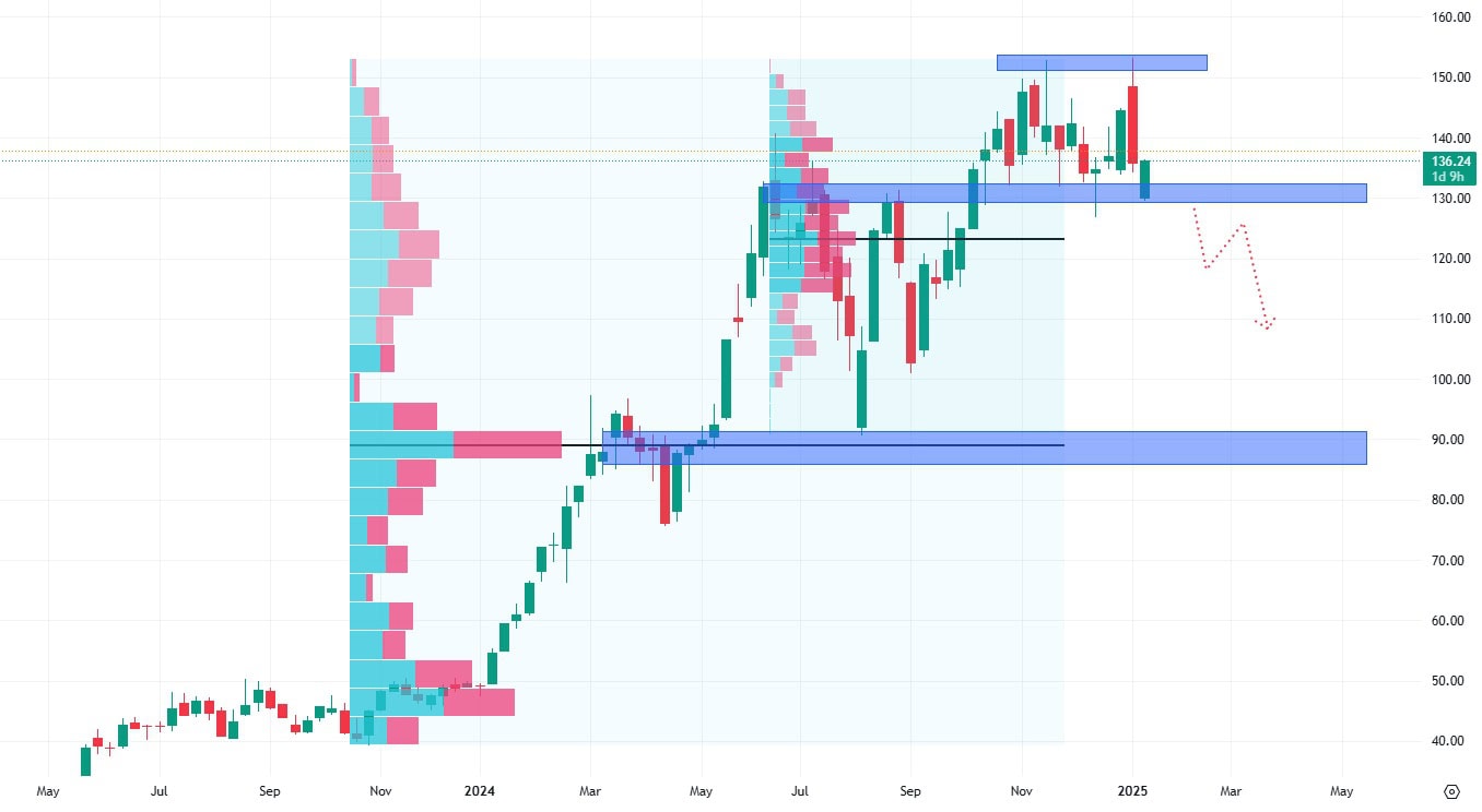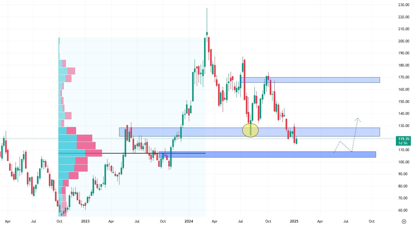 Tento průraz by mohl vést k výraznější technické korekci a to až na hodnotu dalšího supportu na ceně 90 USD za akcii, kde investoři mohou pozorovat silnou volume profile distribuci.