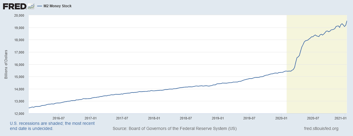 Popsaná monetární a fiskální politika logicky způsobila mohutné zvýšení peněžní zásoby. Během pár měsíců došlo k navýšení z 15,5 na 18 bilionů dolarů. Poté se růst zbrzdil, ale i tak současná peněžní zásoba činí asi 19,5 bilionů dolarů. A během prvního kvartálu roku 2021 určitě dosáhne 20 bilionů.
