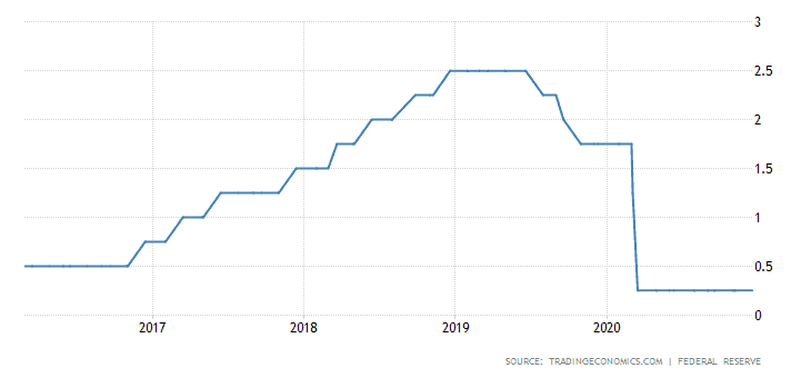 Federální rezervní banka mezi lety 2017 až 2019 pomalu zvyšovala úrokové sazby. Je vcelku normální proces, že centrální banky zvyšují sazby pomalu, protože jinak by hrozilo, že trhy dostanou příliš silný negativní šok. Po nějaké době si tím FED vytvořil jistý “polštář”. Jednoduše řečeno, když nastal problém, mohlo se úrokové sazby zase snížit.