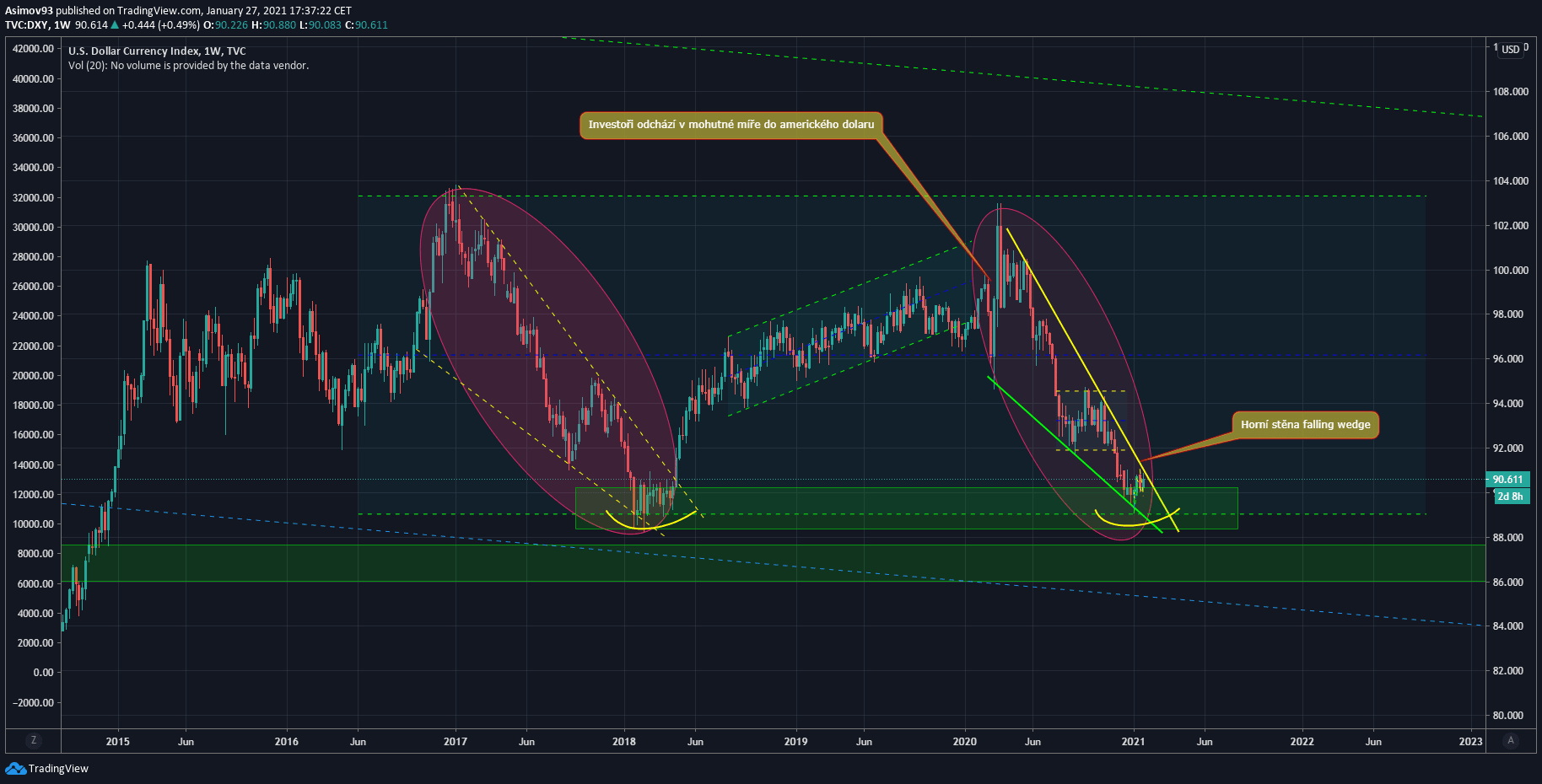 Když začala panika kvůli pandemii Covid, americký dolar po několik týdnů velmi agresivně rostl, avšak brzy následoval prudký pokles trvající v podstatě dodnes (viz graf).