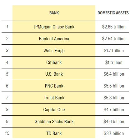 Další banky ze seznamu TOP 10 největších bank v USA disponují tržní kapitalizací pod 1 miliardu USD. Pátá největší banka je U.S. Bank, která byla založena v roce 1863 a disponuje 2 300 pobočkami.