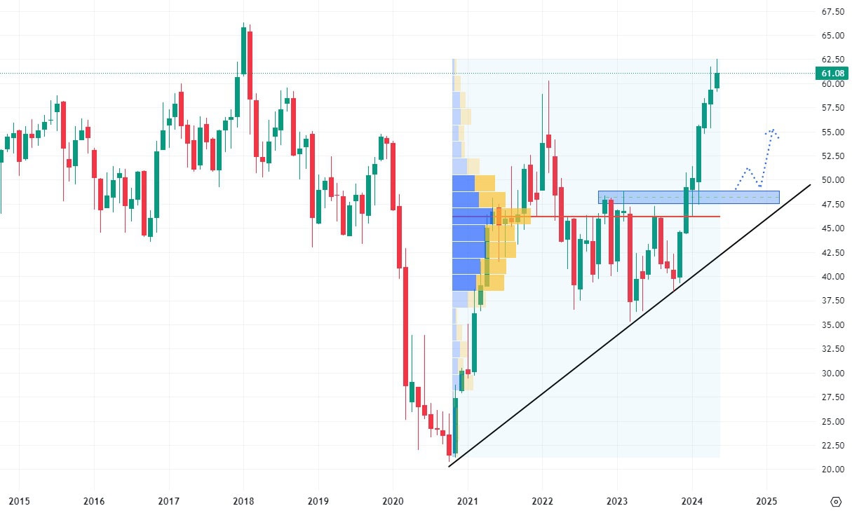 Současný nejbližší support se ovšem nachází poměrně daleko, konkrétně na ceně 50 USD, kde tvoří konfluenci s proraženými cenovými maximy a volume. Pokud by trh tento support otestoval, jednalo by se o výrazný cenový pokles.
