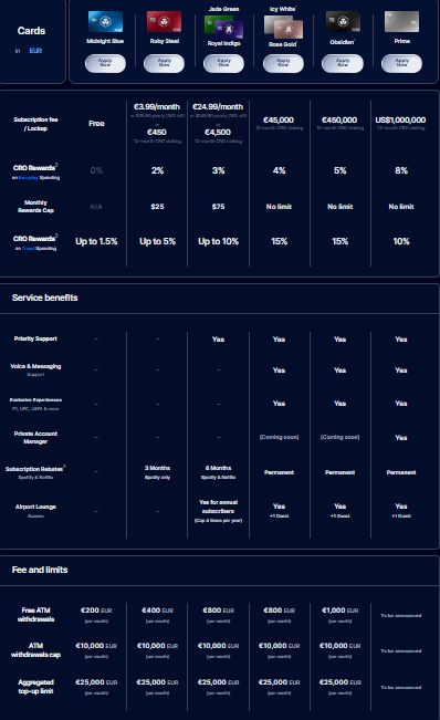 Jednotlivé úrovně karty od Crypto.com. Nejvyšší úroveň zpřístupní cashback ve výši až 8 % z každého nákupu – jak online, tak i v obchodech.