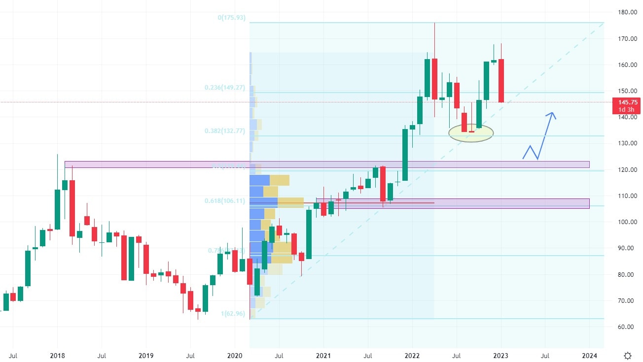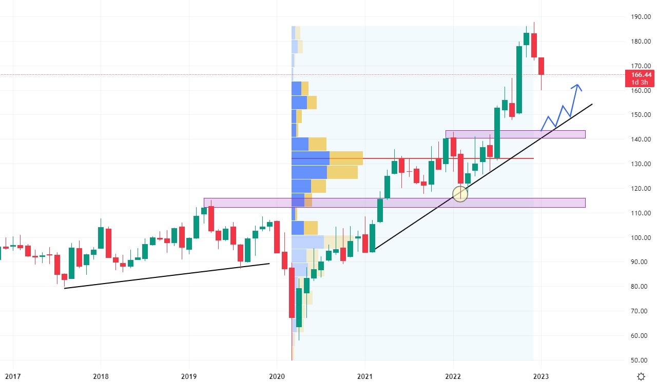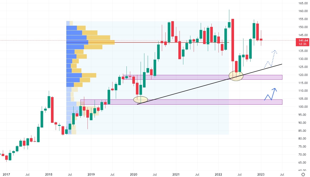 Ukázkový akciový růst vykazuje tato společnost zabývající se distribucí a prodejem automobilových a průmyslových náhradních dílů, od roku 2020. Akcie Genuine Parts se obchodují nad hodnotou rostoucí trendové čáry, přičemž při svém růstu zanechaly výraznou supportní zónu na ceně 140 USD. V současné době trh vykazuje silnější prodejní korekci, která může být dovedena právě na tento support, kde bude vznikat konfluence s rostoucí trendovou čarou.