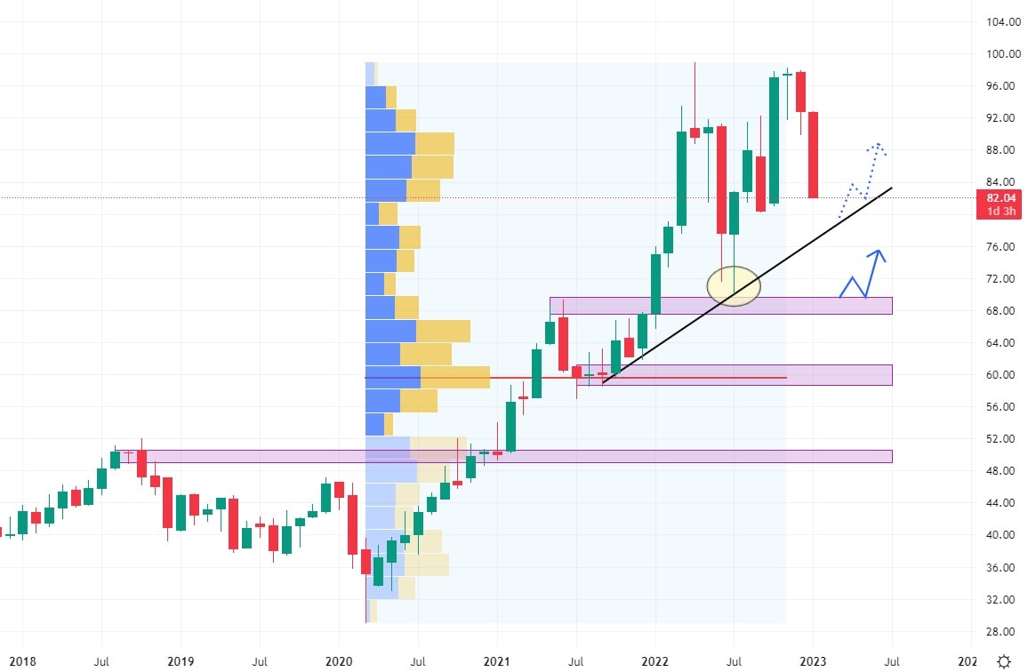 Tato společnost přepravuje, skladuje, zpracovává a prodává zemědělské komodity v mezinárodním měřítku. I akcie Archer-Daniel v současné době vykazují korekční tendenci, která je prozatím největší od roku 2020, kdy trh zahájil svoji cestu vzhůru. Nevýhodou akcií ADM je, že nejbližší support byl v minulosti již testován, což může snížit jeho podpůrnou schopnost. I zde existuje konfluence mezi tímto supportem a rostoucí trendovou čárou.