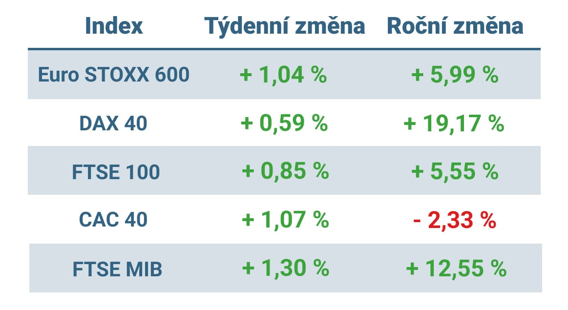 Tabulka ukazuje vývoj nejvýznamnějších evropských indexů v tomto týdnu a v roce 2024