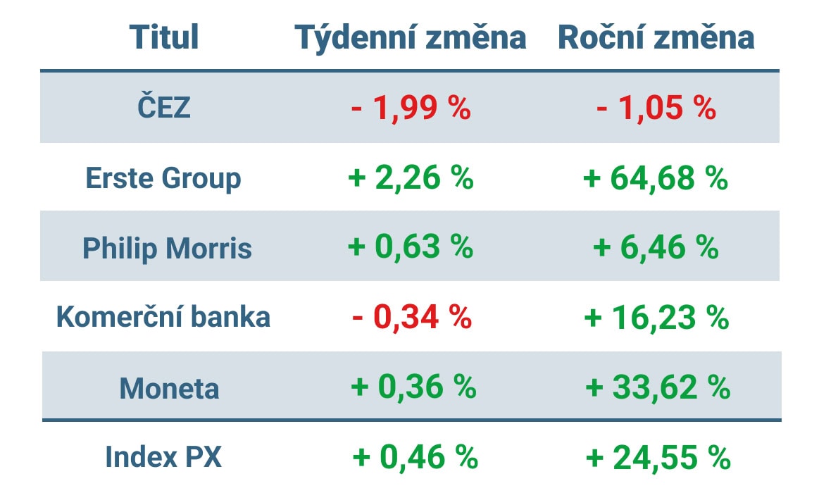 Pražská burza opět rostla, čímž protáhla svou vítěznou sérii na 11 z posledních 12 týdnů. Tentokrát si index PX připsal nepatrných 0,46 % hodnoty a dosáhl úrovně 1 762 bodů.