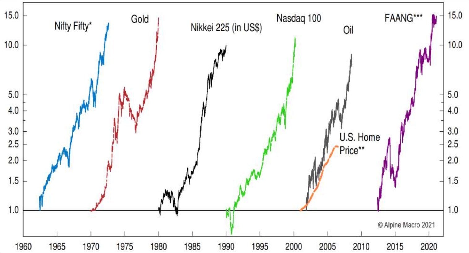 Když se ještě vrátíme k tomu průzkumu, vyplývá z něj, že jen velmi malý podíl respondentů (10 %) se obává prasknutí technologické bubliny. Tohle mě hrozně zaujalo, protože technologické tituly jsou přepumpované až do stropu. V přiloženém grafu je srovnání FAANG (akcie Facebook, akcie Amazon, akcie Apple, akcie Netflix a akcie Google) s jinými historickými finančními bublinami.