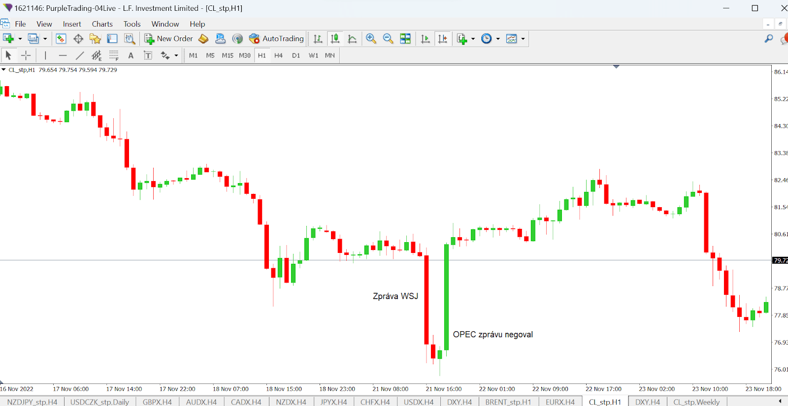 Zde vidíme, že 21. listopadu 2022 WSJ publikoval zprávu, že OPEC zvažoval zvýšení produkce ropy o 500 000 barelů denně. Cena ropy WTI okamžitě klesla z 80 USD za barel k ceně 76 USD. Ropa Brent klesla z 87 na 83 USD za barel. Několik hodin poté však OPEC tuto zprávu dementoval a cena ropy vyskočila zpět na původní úrovně.