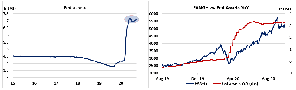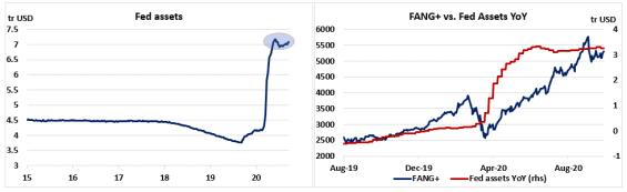 Na obrázku vpravo pak je srovnání růstu bilance Fedu s akciemi FANG+, které z masivních stimulů profitovaly nejvíce. Jakmile bilance Fedu začala stagnovat, zastavil se růst ocenění těchto akcií.