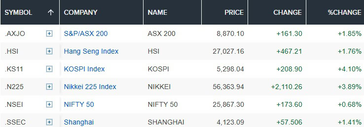 Jižní Korea (resp. její index KOSPI) posílila o více než 4 %, hongkongský Hang Seng Index přidal necelá 2 % a australský index ASX 200 vzrostl o 1,85 %.