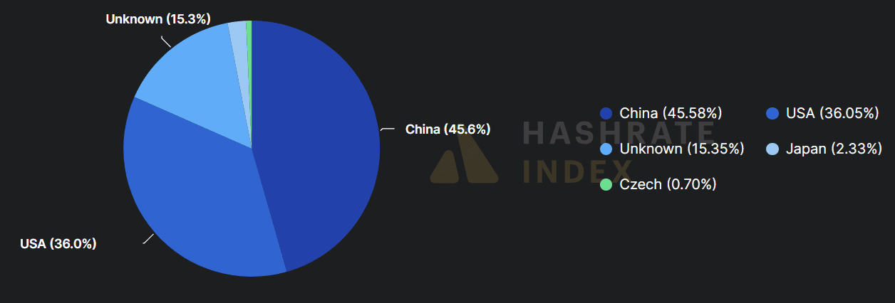 Jak lze vidět výše na grafu, podle dat webu HashrateIndex je přes 45 % výpočetního výkonu koncentrováno v Číně a dalších 36 % v USA.