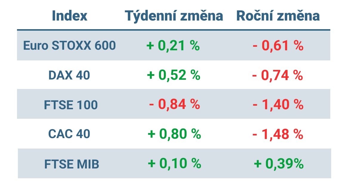 Panevropský index STOXX Europe 600 skončil týden bez větších změn. Podobně také indexy v hlavních evropských ekonomikách. Žádný z nich neznamenal změnu o více než procento, přičemž většina z nich mírně posílila. V záporných číslech skončil pouze britský index FTSE 100.