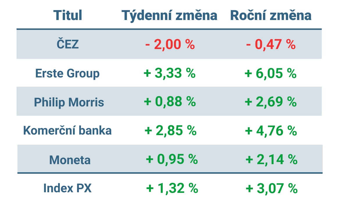Dařilo se většině z nejvýznamnější titulů burzy. Zisk okolo 3 % zaznamenaly bankovní akcie Erste Group a Komerční banky. Necelé procento si pak připsaly i akcie Monety a Philip Morris. Z námi sledovaných titulů se pak propadly pouze akcie ČEZ, a to o rovná 2 %. Jedná se také o jediný ze zmíněných titulů, který se zatím letos obchoduje v záporných číslech.