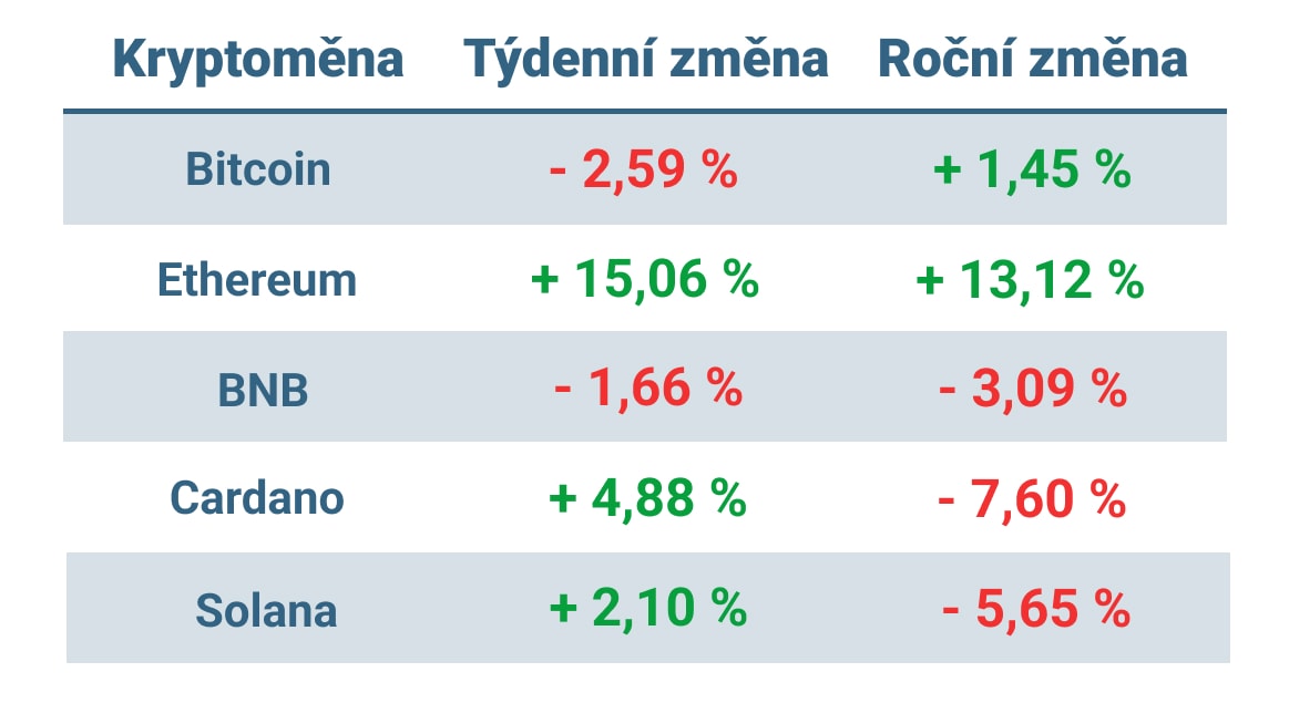 Vývoj ceny nejvýznamnějších kryptoměn za posledních 7 dní a v roce 2024