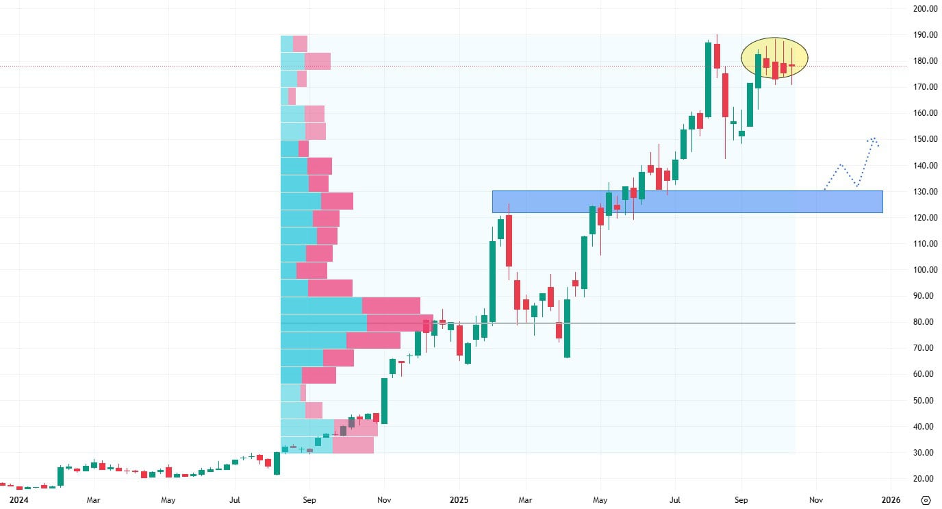 Akcie Palantir se obchodují na svém cenovém maximu, ale již můžeme pozorovat delší knoty svíček, které mohou signalizovat vyčerpání nákupní aktivity.