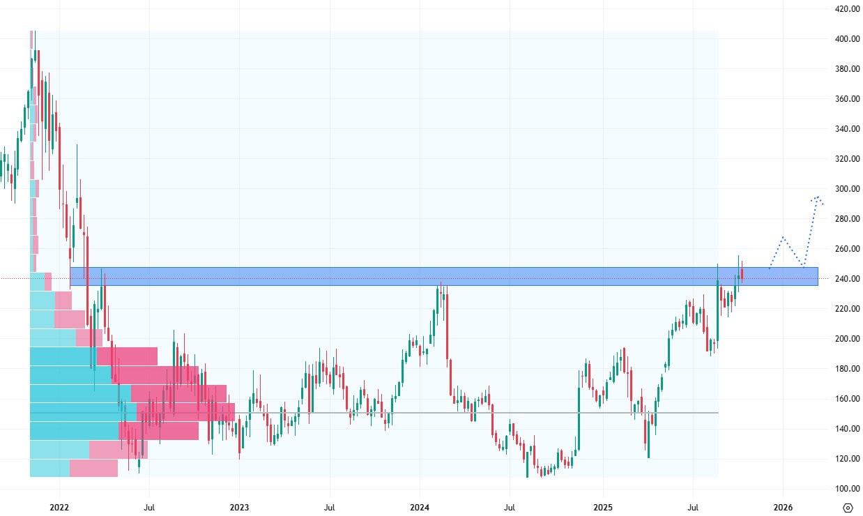 Akcie Snowflake se obchodují na hodnotě velmi důležité rezistence a prozatím to vypadá, že nákupní tlak je natolik silný, že by mohlo dojít k jejímu průrazu. Pokud by se tak stalo, akciím se otevře velmi výrazný růstový potenciál.