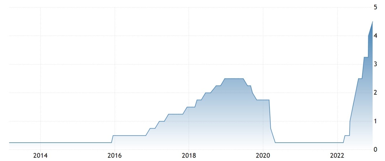Nicméně do roku 2023 jsme vstoupili s úrokovou sazbou americké centrální banky, v rozmezí 4,25 % až 4,5 %, což je nejvyšší hodnota od roku 2007. Očekává se přitom, že už se nemá tato sazba příliš kam zvyšovat. Jeden z hlavních protivětrů akcií v roce 2022 by tak už neměl sílit a spíše s postupem času opět oslabovat, což by se mělo pozitivně odrazit i na americkém akciovém trhu.