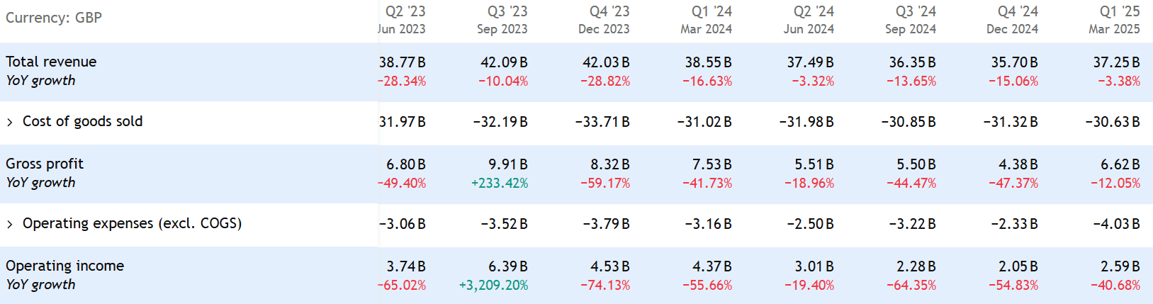 Výsledky v Q1 2025 byly za očekáváním. Tržby dosáhly 37,25 miliardy GBP a v meziročním srovnání klesly o 3,38 %. Provozní zisk se snížil o 40,68 %.