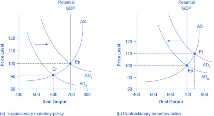 Když centrální banka sníží úrokové sazby (akomodativní politika), agregátní poptávka (AD) vzroste, protože vzroste poptávka po penězích a zároveň stoupnou investice.