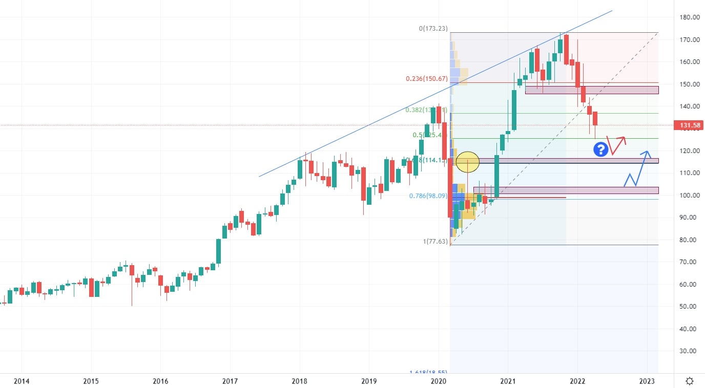 Akcie JPMorgan Chase se nacházejí v klesajícím trendu, který se blíží ke své první výraznější supportní úrovni. Ta je ovšem tvořena pouze výrazným High, ve kterém došlo ke změně nabídky a poptávky. Sice se jedná o zajímavý support, který ovšem predikuje menší množství důvodů pro investiční aktivitu. Ovšem druhý support na ceně 100 USD za akcii, vypadá velmi zajímavě. KonfluenceVolume a 78,6 % Fibonacciho retracementu vytvářejí zajímavý support, který by mohl být v hledáčku dlouhodobých investorů. Akcie této banky v roce 2022 vykázaly propad již 26 %.