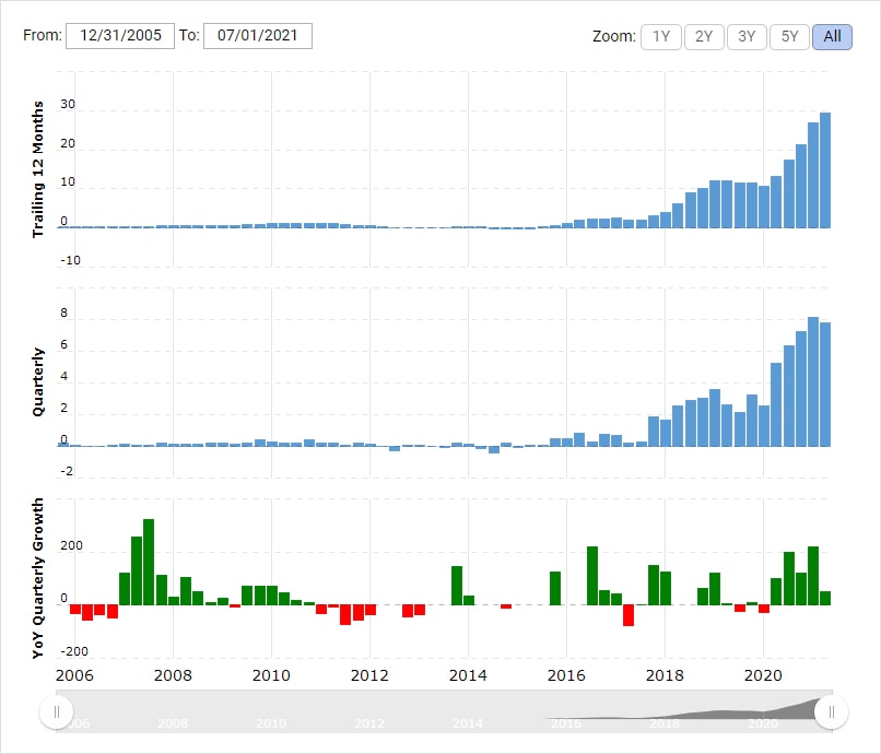 Vývoj ceny akcií Amazon za posledních 12 měsíců však neodráží základní fundamenty společnosti – v Q2 2021 Amazon vykázal 48% meziroční nárůst čistého zisku. Předchozí 4 kvartály pak vykázala společnost dokonce trojciferné nárůsty ziskovosti.