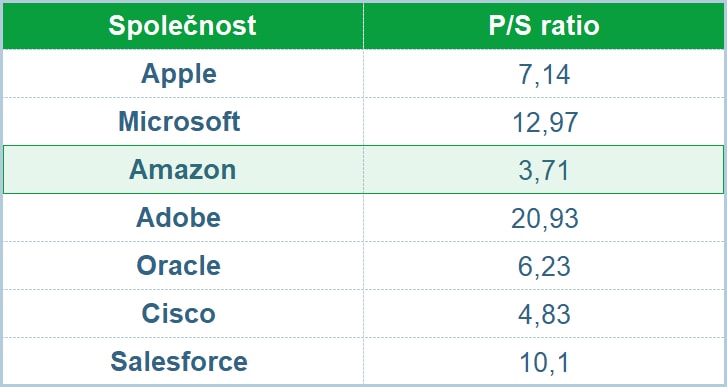 Jak můžete vidět v tabulce níže, ve srovnání se společnostmi, jako jsou Apple, Microsoft, Adobe nebo Salesforce se Amazon jeví jako levný.