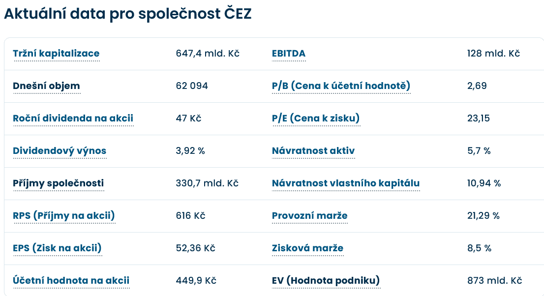 Klíčové údaje o akciích ČEZ k 21. dubnu 2026.