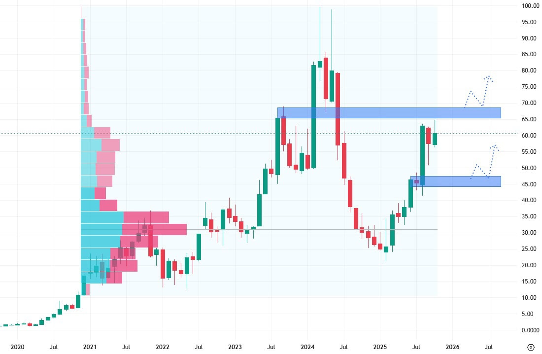 Akcie Celsius se obchodují v agresivním rostoucím trendu, nicméně zrovna retestují hodnotu rezistence na ceně 65 USD za akcii.
