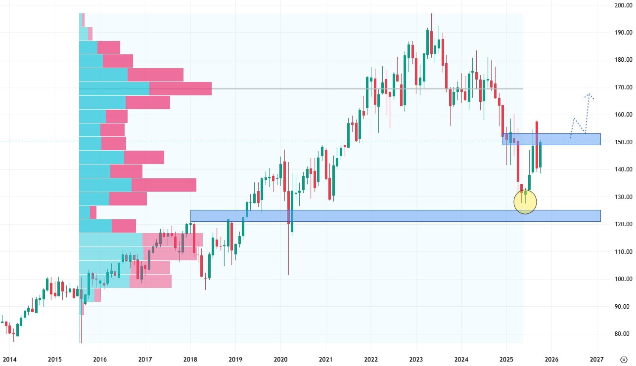 Akcie Pepsi aktuálně retestují hodnotu rezistence na úrovni 150 USD poté, co došlo k jejich agresivnímu odrazu. Pokud by akcie dokázaly rezistenci prorazit, otevřely by se jim dveře k dalšímu výraznému růstu.